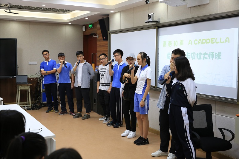 我校作为该活动的承办单位之一,有幸邀请到此次活动的参与乐团之一、来自国内优秀的阿卡贝拉队伍——广州WOW人声乐团向同学们介绍阿卡贝拉的起源和发展,以及它与传统合唱的区别。WOW人声乐团选取了国内一些怀旧、经典的歌曲,采取“演唱+互动”的方式现场演绎了不同时期的阿卡贝拉音乐作品,通过现场示范,认真教授大家人声演唱的技巧,共同体验阿卡贝拉音乐的独特魅力。