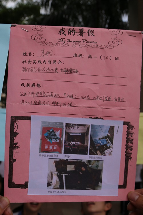 此次2015级部的暑期社会实践活动由校德育处、校团委牵头组织,2015级部制订计划并具体实施。据了解,此次社会实践成果展共展出由2015级部各班推荐的社会实践感想近两百幅,于学校架空层内集中展出,图文并茂的记录着同学们在暑期实践活动中发生的点点滴滴,共同构成了一道亮丽的风景线。不同颜色的纸张在初秋的风中翻飞,一张张记录着学生忙碌身影的照片,一页页记录同学们们实践心得的文章,点点滴滴都是同学们利用暑假走进社会、体验生活、锻炼能力、挑战自己的成长写照。照片中,有的同学来到智康中心,陪那里的小朋友玩耍,在社区敬老院慰问老人,在深圳街头的志愿者之家做着文明劝导,为社区打扫卫生除“牛皮癣”,传递着尊老爱幼的传统美德,更是为创建和谐社会风气做着自己的贡献;有的同学在工厂中搬运产品文件,在各种生产线中积极体验着生活;还有的同学向大家分享在暑期读到的一本好书,汲取书中的知识,思考感悟,写下自己的心得体会,让自己进一步成长;也有的同学选择远行,离开深圳去到一个新的地方,欣赏不同的风景,感受不同的人文气息。成果展全面、生动、形象地反映2015级部同学暑假社会实践活动的丰富生活,让更多的同学了解社会实践、支持社会实践、加入到社会实践的行列中。展板刚一展出,就在全校范围内引起了广泛关注,吸引了不少师生经过的时候驻足观看。同学们纷纷表示,成果展让大家对社会实践有了更深一层的理解,也激发了大家对社会实践的积极思考和参与热情。