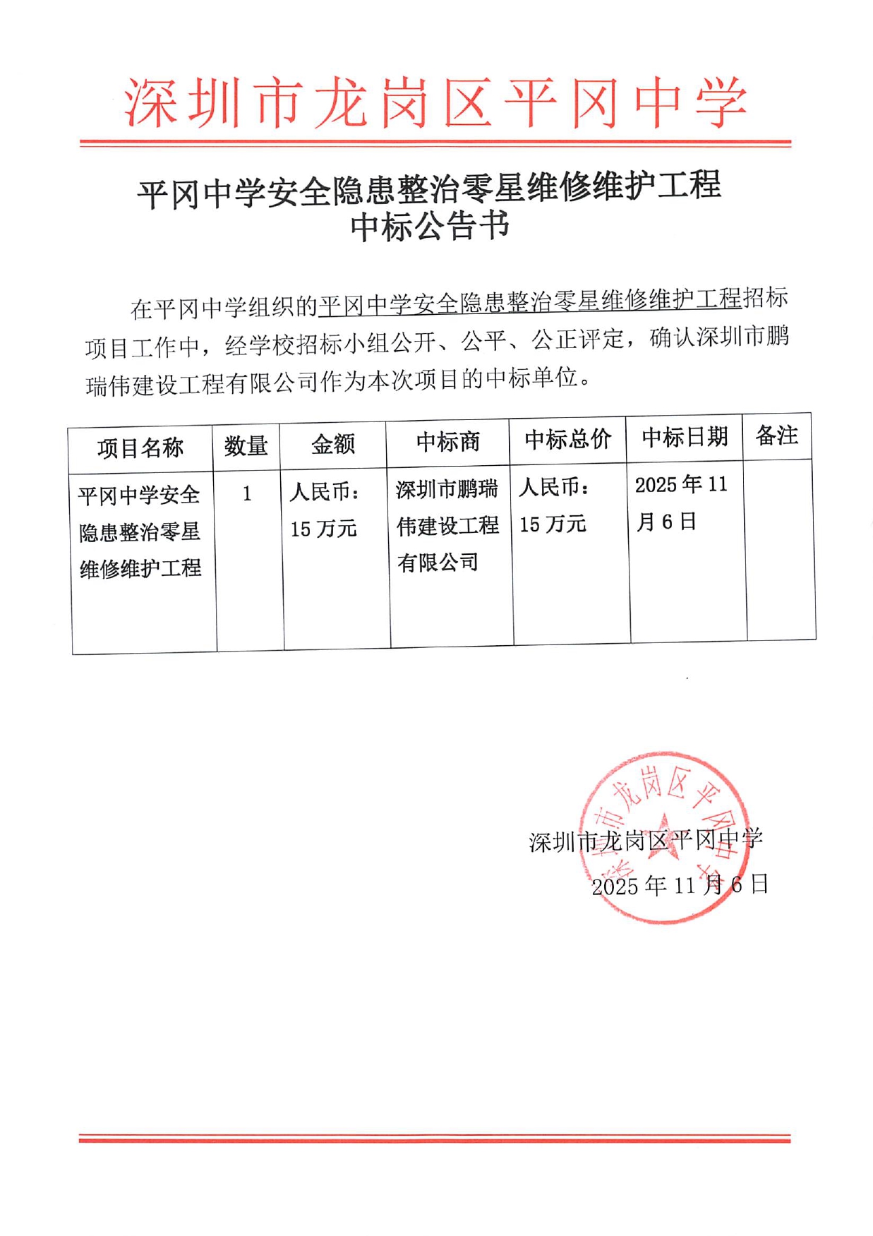 2025年深圳市龙岗区平冈中学安全隐患整治零星维修维护工程招标公告