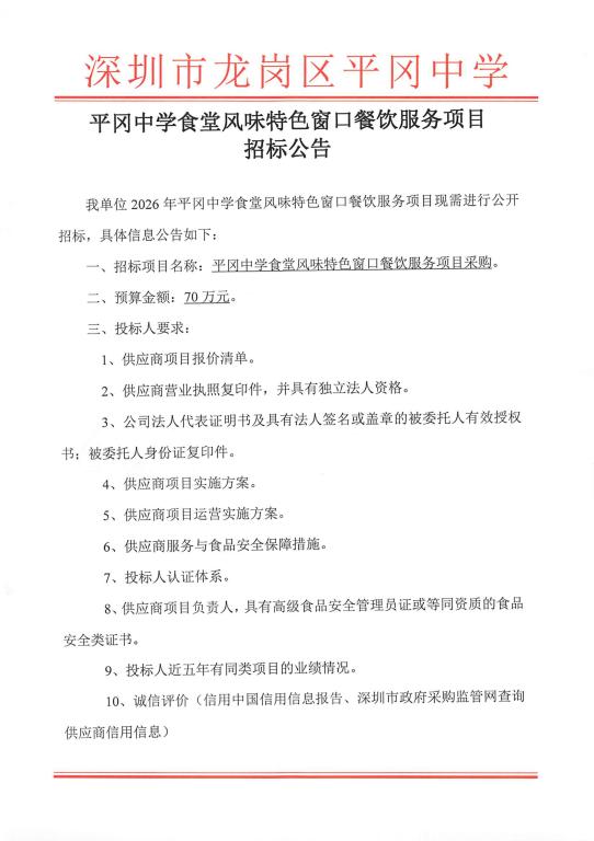 平冈中学食堂风味特色窗口餐饮服务项目招标公告