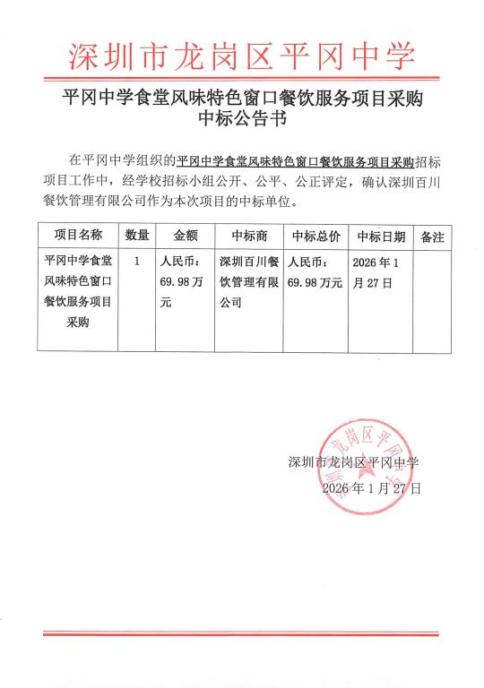 平冈中学食堂风味特色窗口餐饮服务项目采购中标公告书